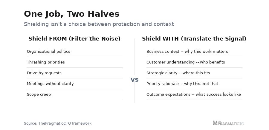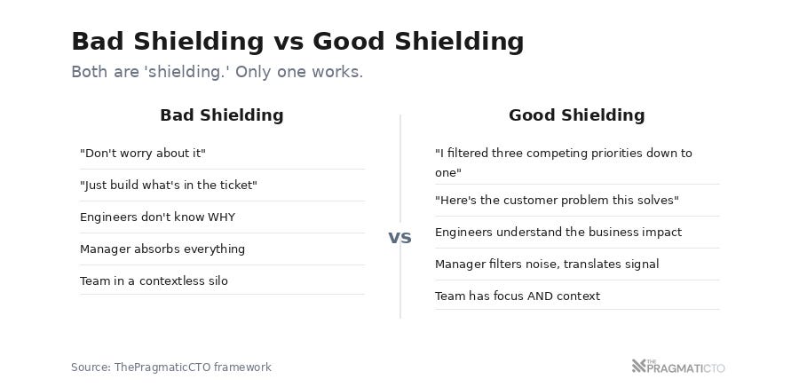 It meant filtering out noise (organizational politics, thrashing priorities, executive drive-by requests) so engineers could focus on work that matters. Done right, shielding is the mechanism that delivers context; it removes the static so the signal gets through. If your version of "shielding" produced engineers who didn't understand the business, you weren't shielding too much; you were communicating too little. The job isn't to choose between protecting focus and providing understanding. The job is to do both.